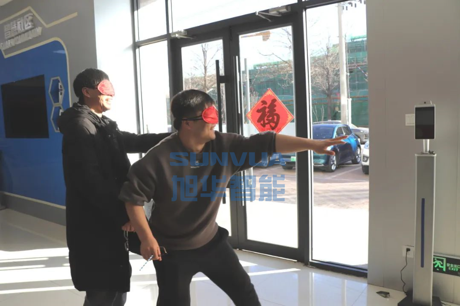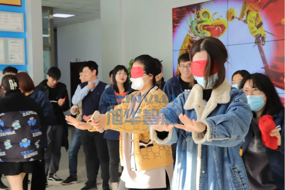 在摸福字环节,参赛者原地转圈之后蒙眼摸福,摸到福字者象征着一年都拥有福气、福运,是公司对各位员工的美好祝福。大家转圈之后走的东倒西歪,现场其乐融融,笑声不断。